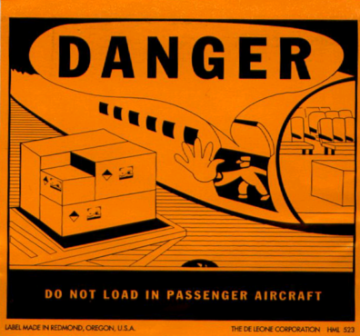 One (1) DANGER DO NOT LOAD IN PASSENGER AIRCRAFT on top of the transport box.